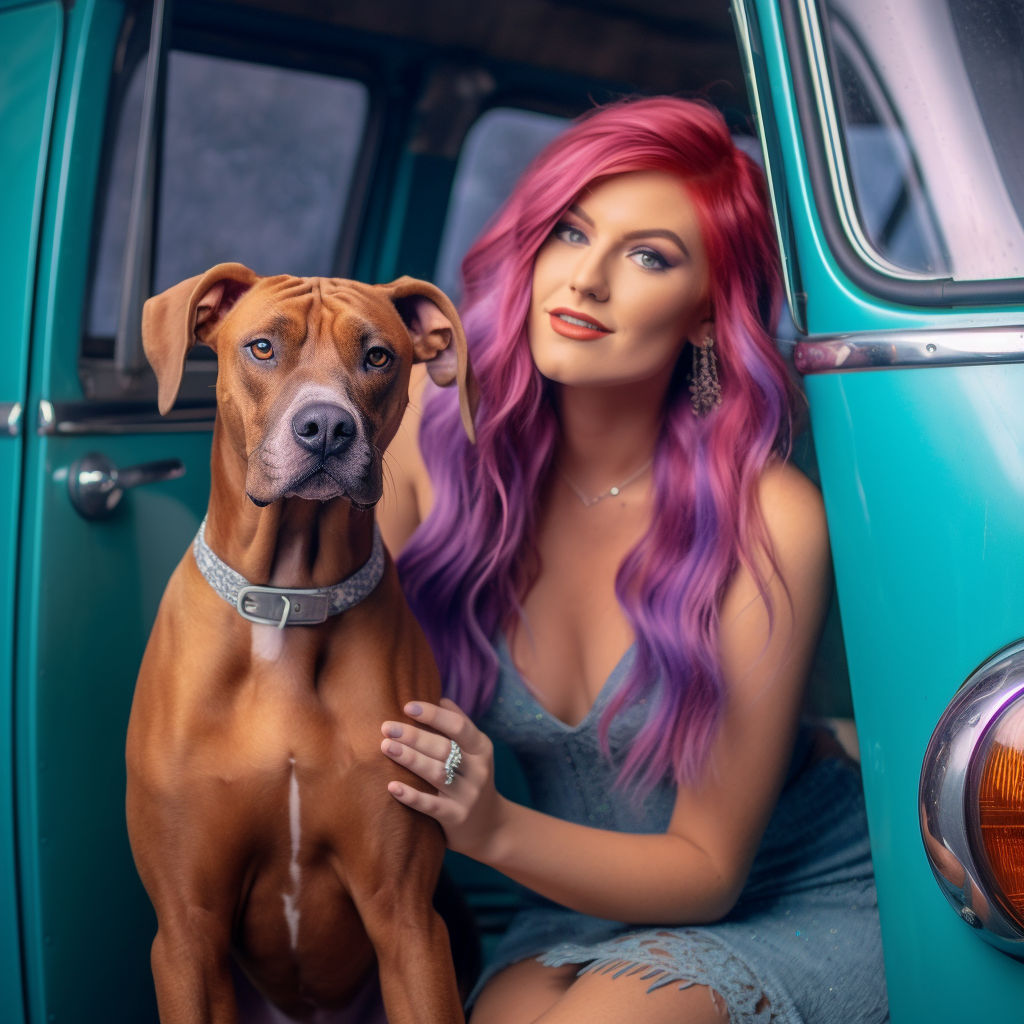 Editorial centerfold photoshoot of beautiful smiling gorgeous 20 year old peppy cheerleader model influencer young woman student with red hair and wearing subtle soft makeup and purple minidress while sitting down with a large breed great Dane dog inside of a teal VW bus, stunning face, captivating eyes