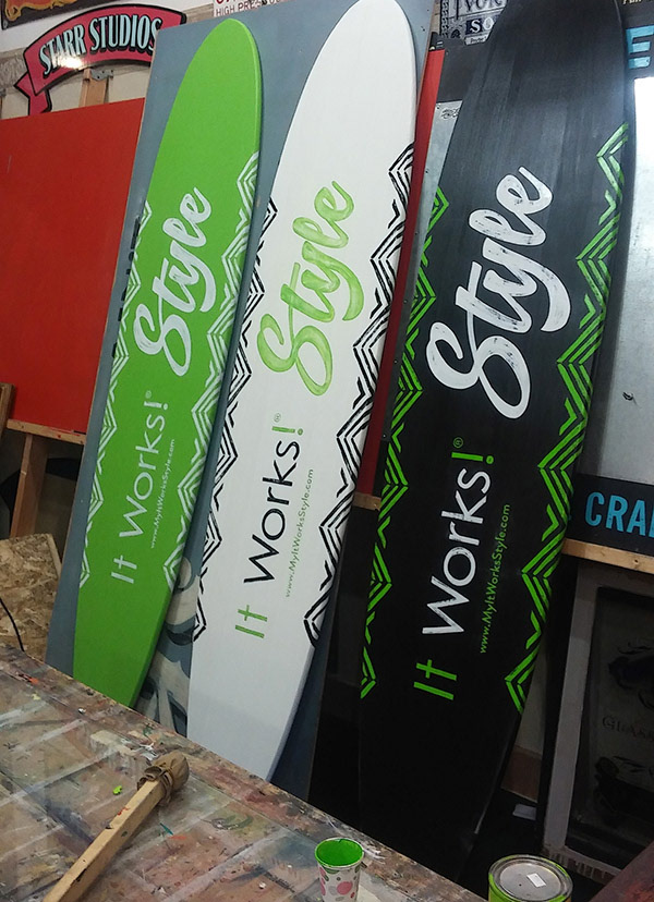 The It Works! Green Carpet event occurs each summer in Bradenton, FL as a Sales training & keynote presentation by the organizations lead executives. Unlike the January events for It Works, the Green Carpet event is more intimate and plays off of the location in Florida as a primary theme. When the client asked us to produce some high impact store signage that carried an authentic, Jimmy Buffet swagger, and that would belong on the beach, I looked no further than renowned sign painter, Sean Starr. With the help of Sean and his small team, I was able to deliver some great centerpieces to these events that were so well received, that the surfboards now reside in the CEO's own island home.